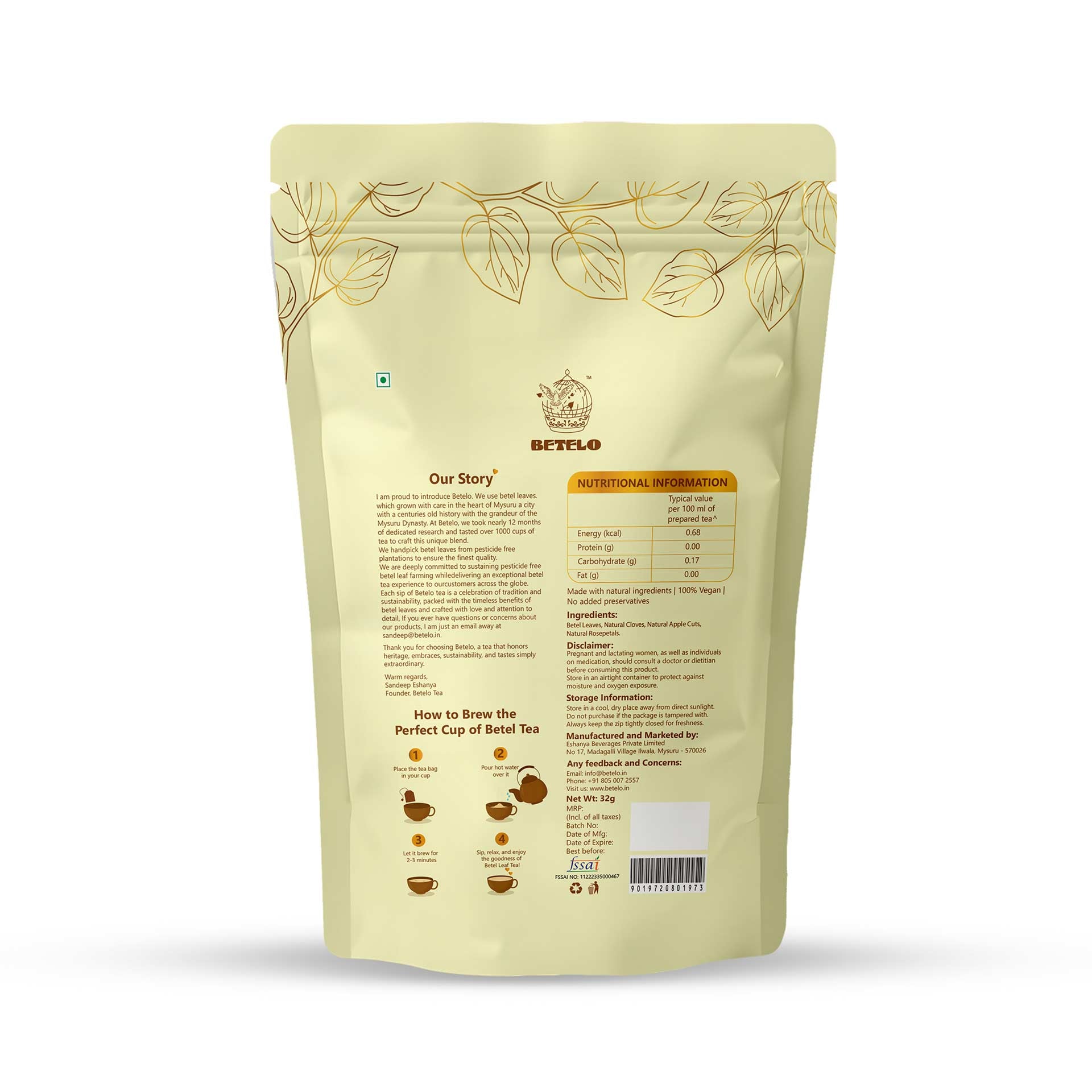 To enjoy BetelO, simply place a pyramid tea bag in a cup and pour hot water over it. Let it steep for 2-3 minutes to release its rich, herbal goodness. After use, place the bag back in the pouch and seal it to preserve its freshness and aroma.