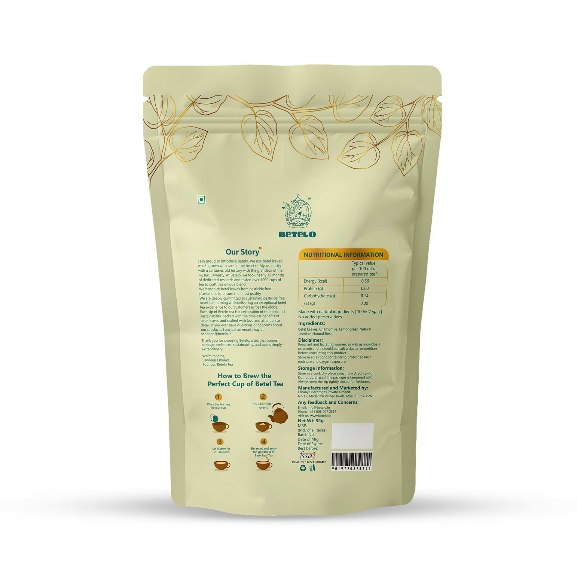 BetelO contains carefully processed betel leaf tea blended with natural herbs, offering a unique and refreshing wellness experience. Each blend is thoughtfully packed in premium, food-grade pyramid tea bags to ensure purity, flavor, and aroma in every sip.