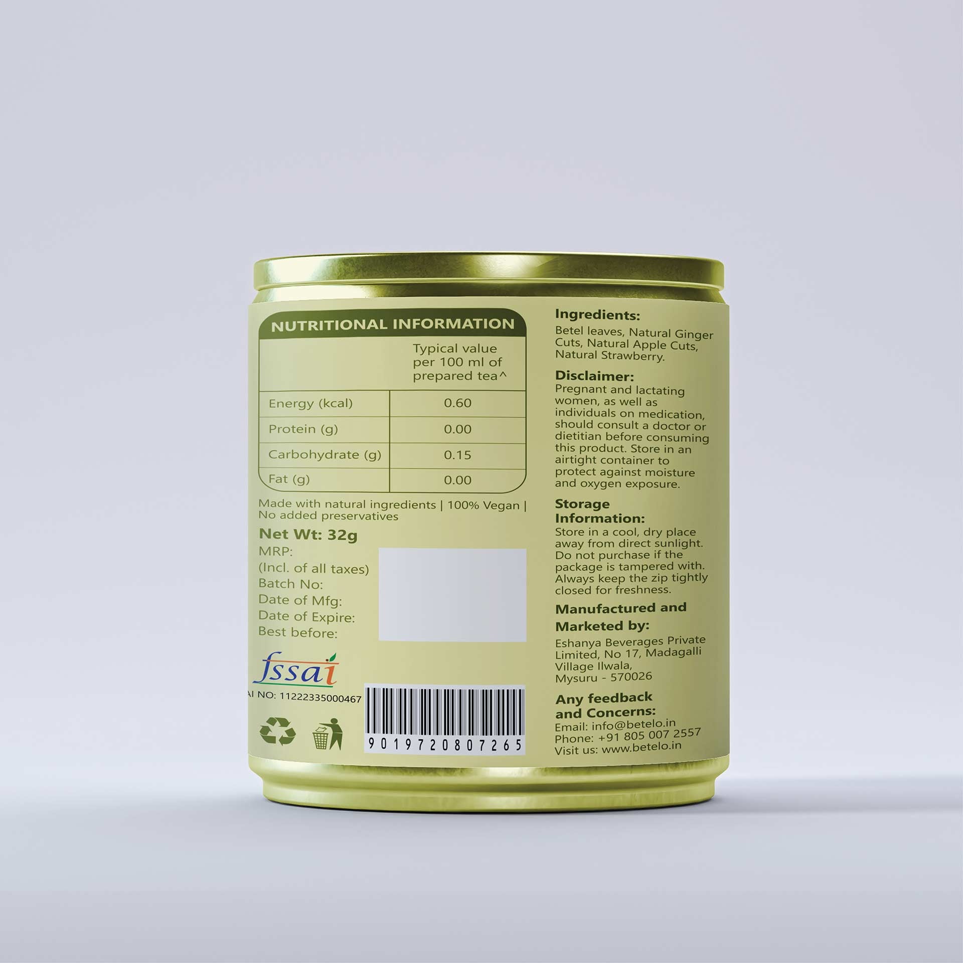 Palace Touch is a thoughtfully crafted infusion that brings together nature’s most restorative botanicals. Grounded in the age-old benefits of betel leaves, this blend features the warming strength of ginger, the sweet crispness of apple, and the vibrant notes of strawberry. Each ingredient is chosen to support digestion, boost immunity, and deliver a naturally flavorful wellness experience—fit for royalty.